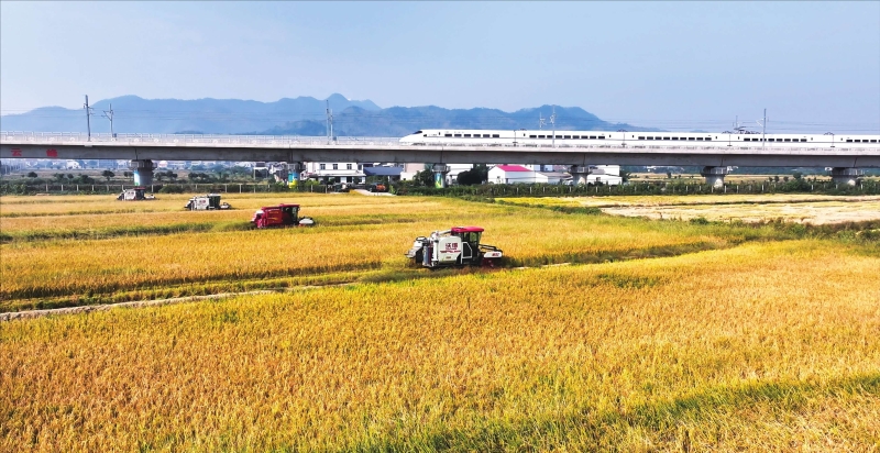 金风送爽,稻浪翻滚,田间地头一派丰收繁忙的景象。
