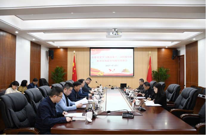 4月21日,市委党史学习教育第十二巡回指导组到市市场监管局召开见面会并开展第一轮巡回指导。指导组副组长夏年丰在会上讲话。市市场监管局党组书记朱崇文汇报市市场监管局前段党史学习教育工作情况,局党组成员、副局长鲁志强主持见面会。