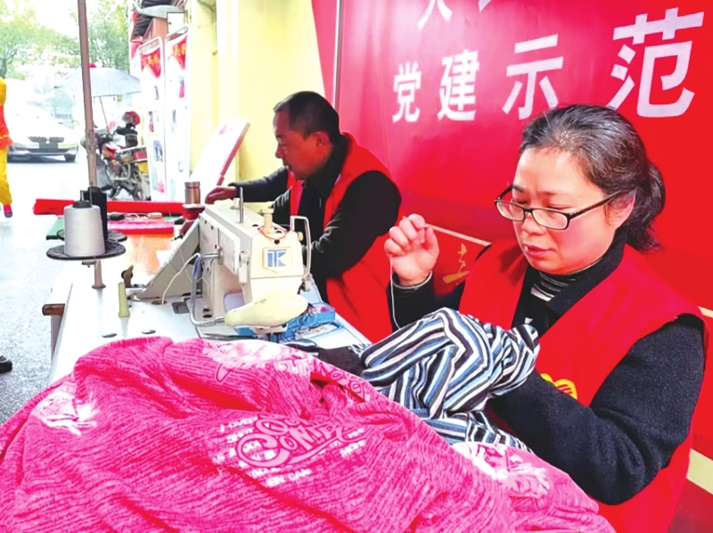 廖正安在为社区居民缝补衣物。陈浩军摄