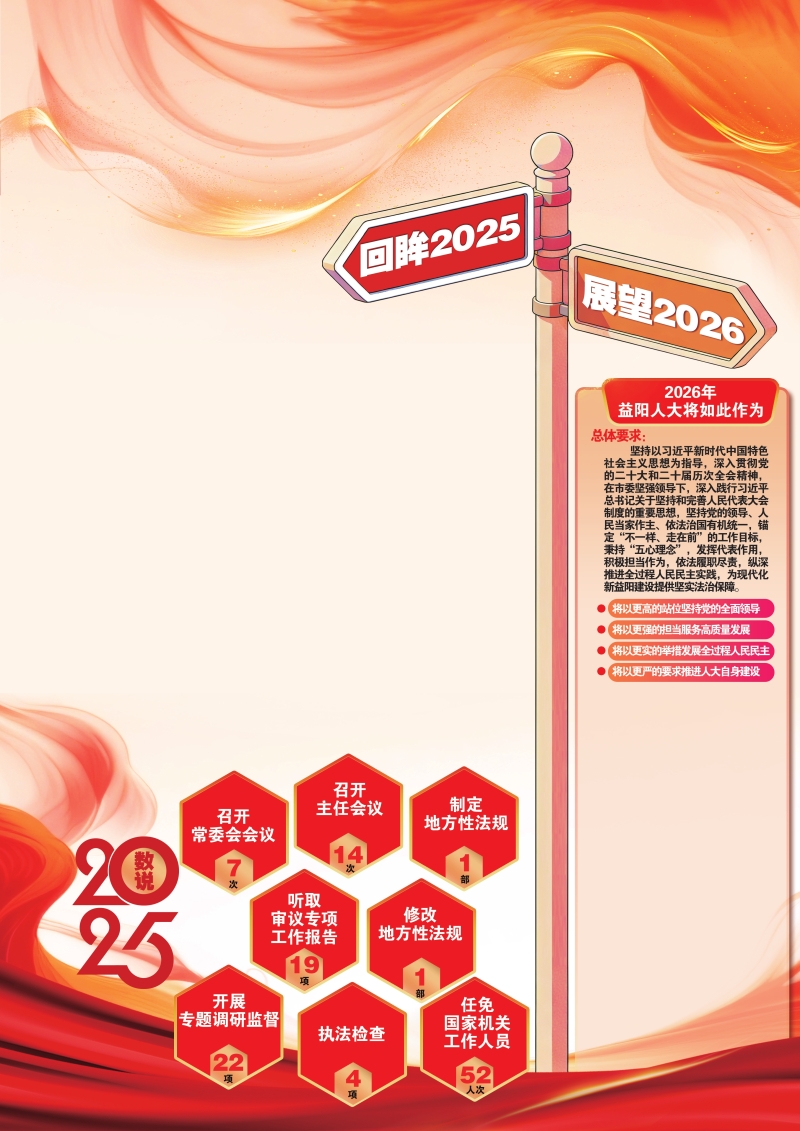 报告指出,2025年,是决胜“十四五”、谋划“十五五”,进一步全面深化改革、建设现代化新益阳的关键一年。在市委的坚强领导下,市人大常委会高举习近平新时代中国特色社会主义思想伟大旗帜,深入贯彻习近平总书记关于坚持和完善人民代表大会制度的重要思想,全面落实党的二十大和二十届历次全会精神,认真履行宪法法律赋予的各项职责,充分发挥代表主体作用,着力践初心、担使命,始终重实干、讲实绩,力求“不一样、走在前”,紧跟核心,在学思践悟中坚定政治忠诚;坚守初心,在强基赋能中扛牢人大之责;服务中心,在厉行法治中发挥制度优势;顺应民心,在深化联系中回应群众关切;独具匠心,在守正创新中铸就特色品牌。全年共召开常委会会议7次、主任会议14次,制定、修改地方性法规各1部,听取审议专项工作报告19项,开展专题调研监督22项、执法检查4项,任免国家机关工作人员52人次,全面完成市七届人大五次会议确定的目标任务,交出了一份厚重的答卷。