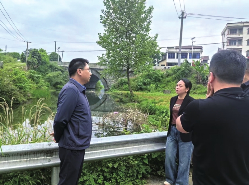 ▲县委常委、副县长郭环球(左)在田庄鱼胶溪入河排污口整治现场指导工作。