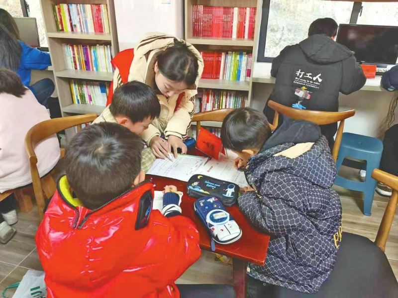大溶溪社区书屋里志愿者陪孩子写寒假作业。