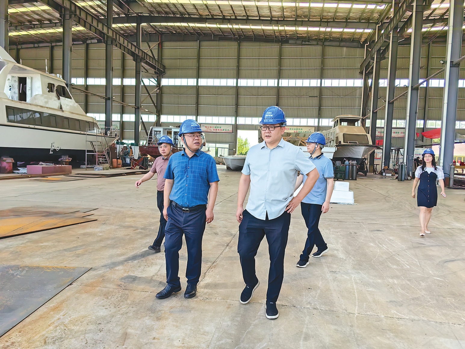 沅江市人民法院党组书记廖红辉前排(左一)走访船舶企业。