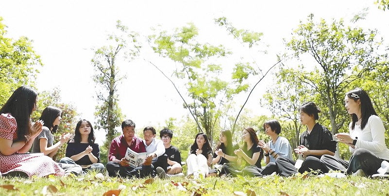 农民诗人与大学生在校园草坪上一起交流诗歌创作的体会。图片由湖南城市学院提供