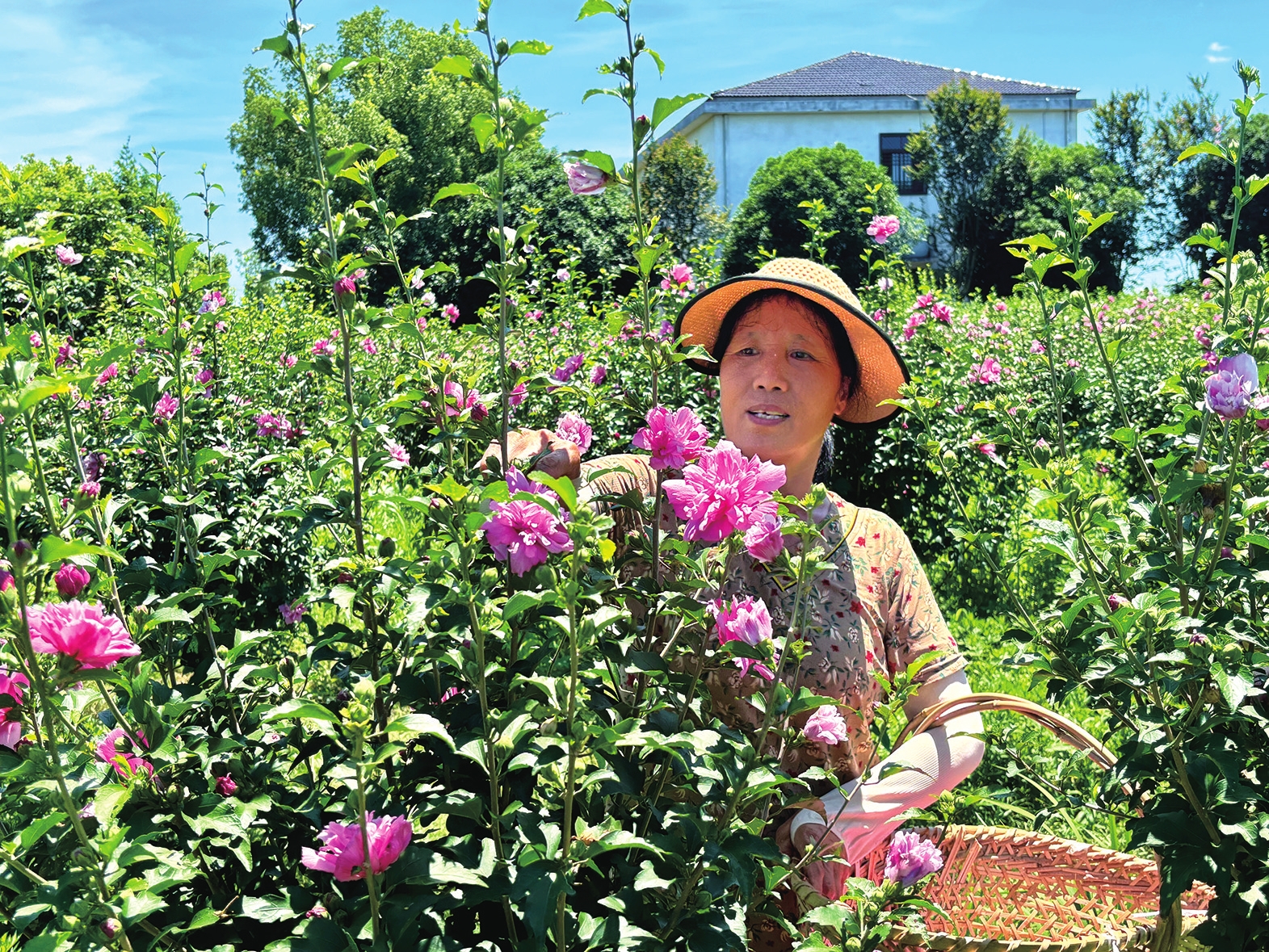 “在我们村,不管是房前屋后或是荒地山坡,全都种上了木槿花。”先锋桥村党支部书记黄正和介绍,村里曾面临零散土地与荒山资源闲置的困境。2019年,先锋桥村开始引种木槿花,但初期种植户不足百户。面对土地瓶颈,村“两委”提出“五边”策略,在路边、塘边、渠边、菜园边和田块边“见缝插针”种植。通过这一模式,逐步构建起“公司+合作社+村民”的利益联结机制,将木槿花种植规模发展到800多亩。去年,村集体经济收入突破80万元。