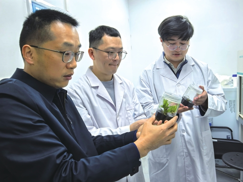 实验室里,张国勇(左一)了解黄精生长情况。陈浩军摄