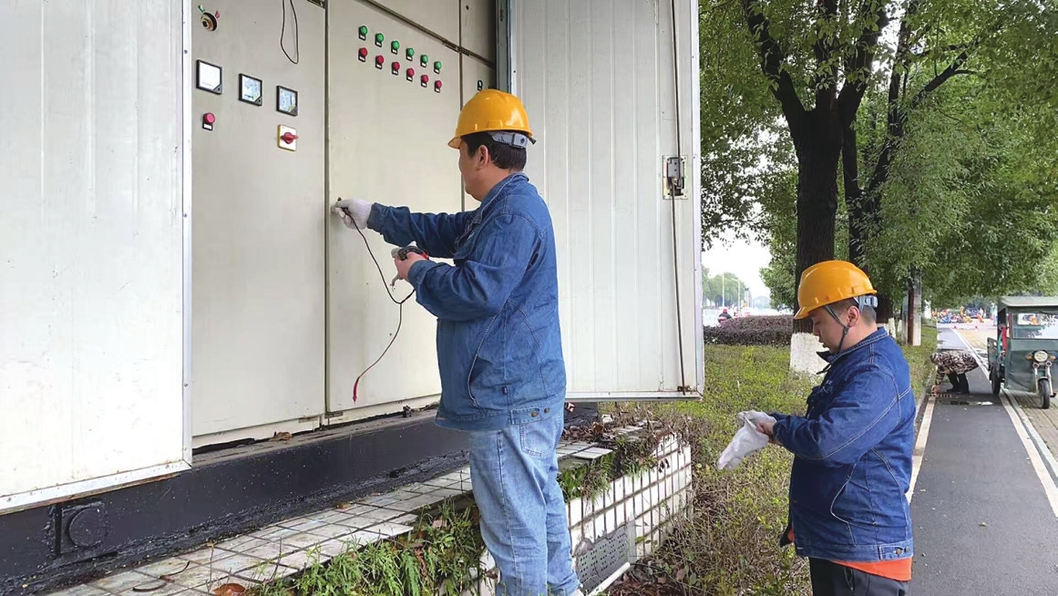 维修人员检查中心城区路灯设施。李胜利摄