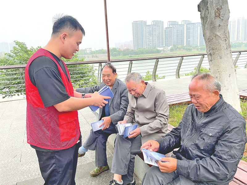 志愿者向居民发放网络安全宣传折页。周琳摄