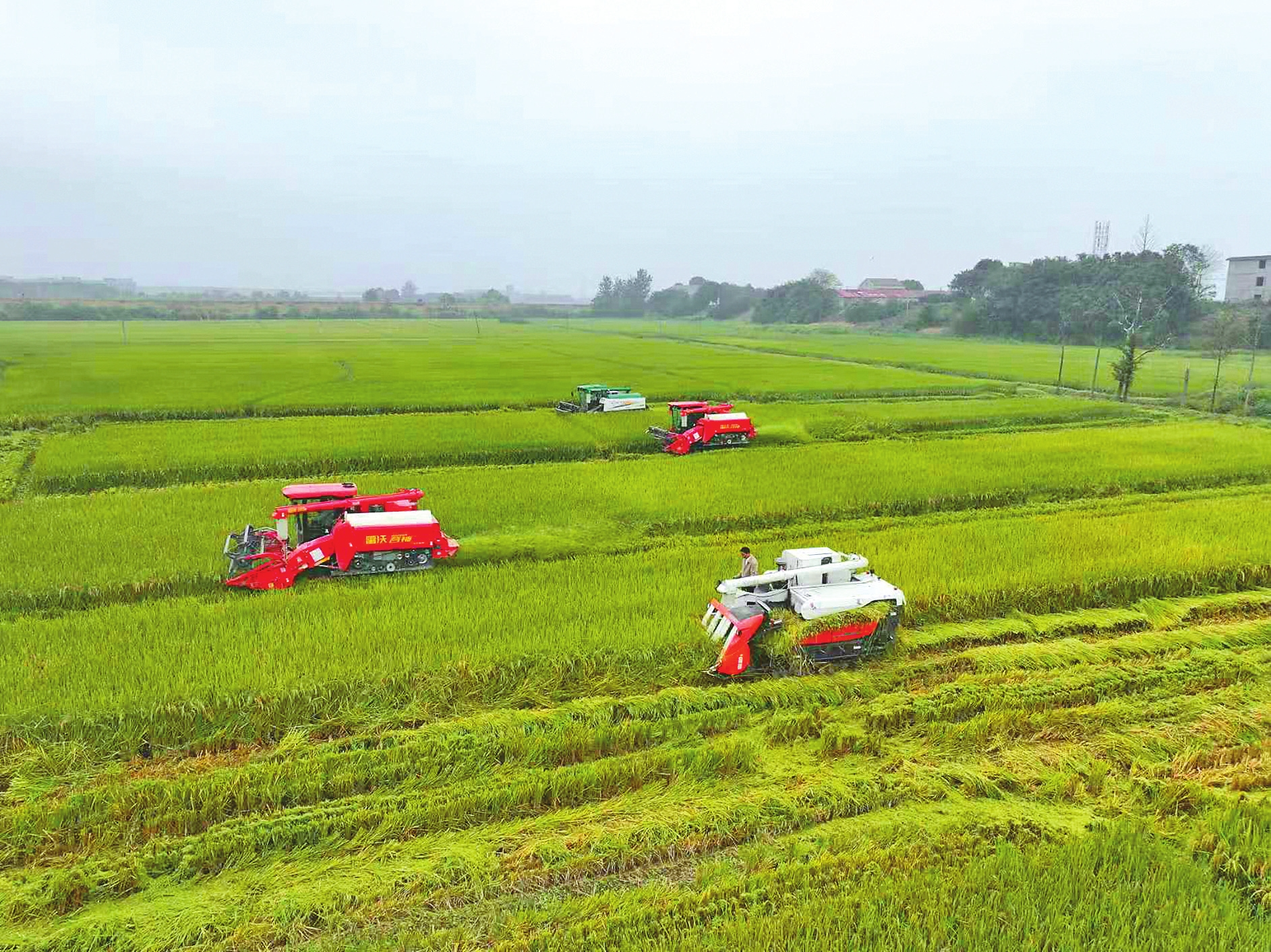 9月25日,细雨霏霏,在沅江市琼湖街道保民村1000亩稻田里,4台收割机轰鸣着开始收割,只见长长的谷穗快速吞进“铁嘴”,谷粒像水流一样通过管道源源不断地流进车斗里。种粮大户王剑良摘下一颗谷粒放进嘴里嚼着,喜滋滋地说,亩产预计比往年高50公斤左右,达到650公斤。