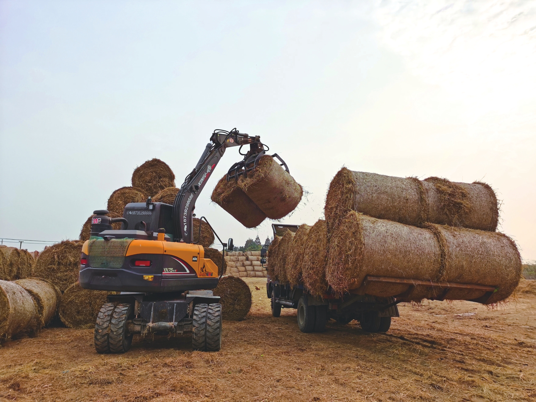 于是,在冬日暖阳铺洒的茈湖口,机械在金黄的田垄间来回穿梭,散落的秸秆被精准收拢、强力挤压,变成一个个圆滚滚的草捆;乡间道路上,驾驶员们神情专注,运完一车便马不停蹄折返田间,只为抓紧农时抢收秸秆;农民也在忙个不停:有的协助疏导机械作业,有的帮忙规整草捆,欢声笑语与机械轰鸣交织成茈湖口镇田野里“二次收获”的交响。