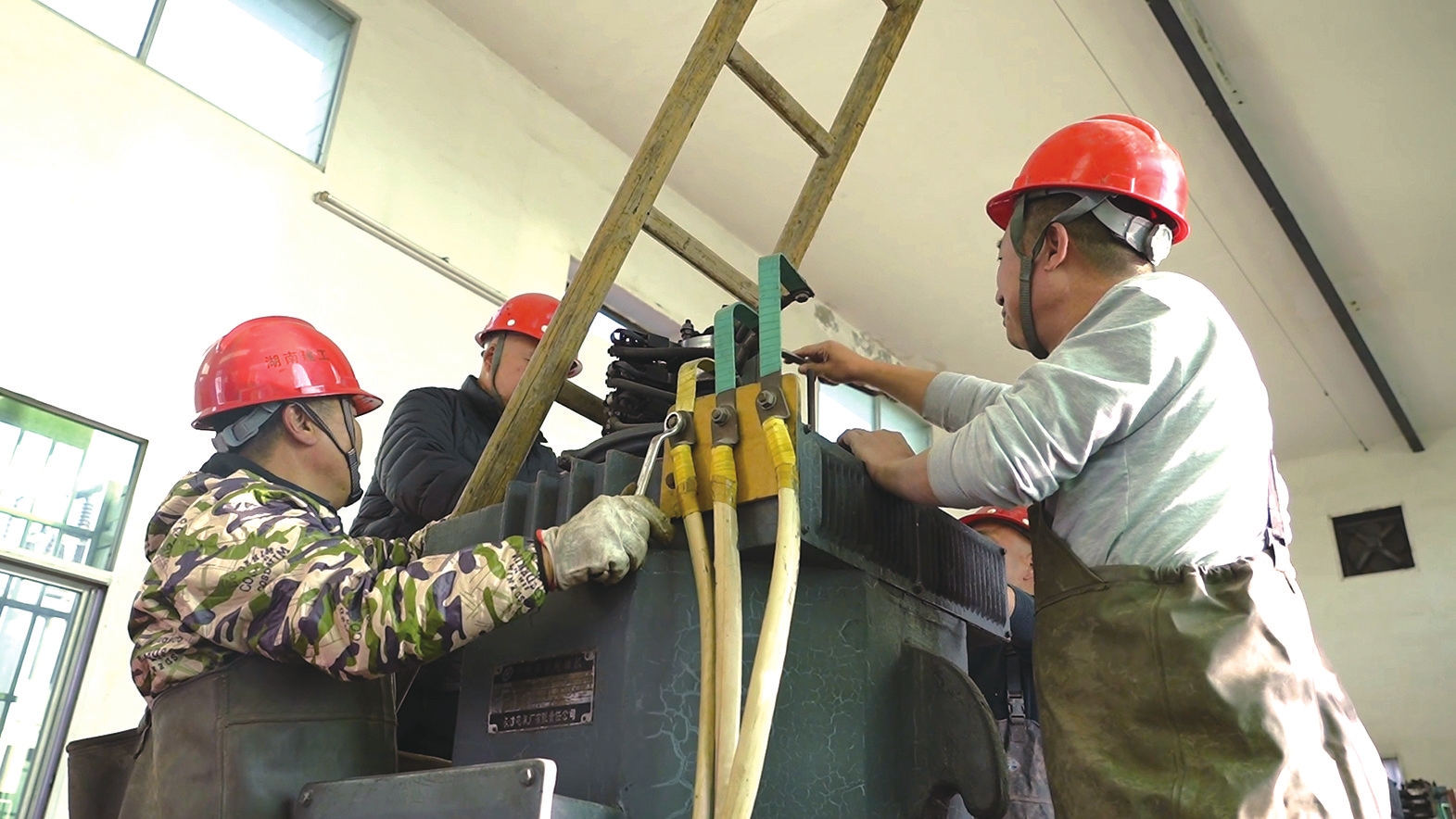 在明山头镇平伏电排排灌站,工作人员正在开展冬季水利检修。刘馨予摄