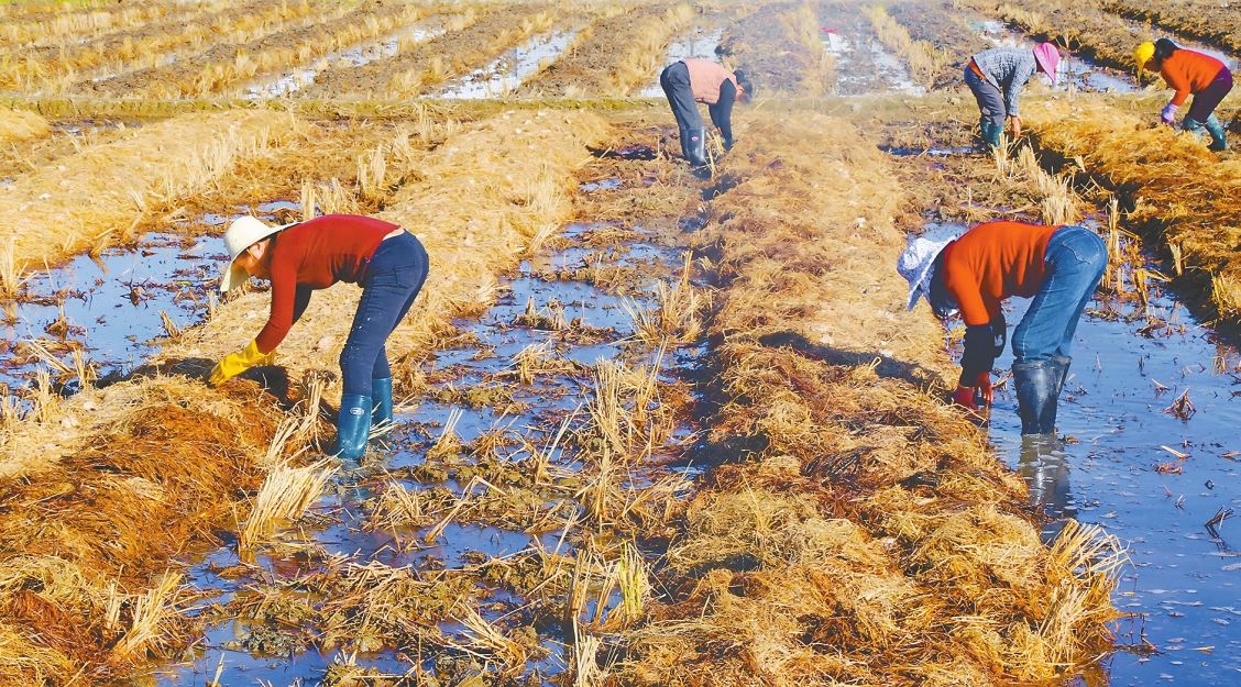 富兴村村民在田间种植赤松茸菌种。王澳文摄
