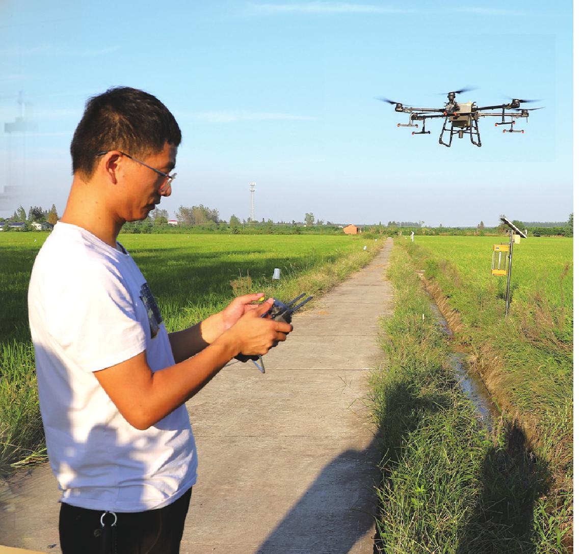 “飞手”驾驶无人机观察农作物生长情况。