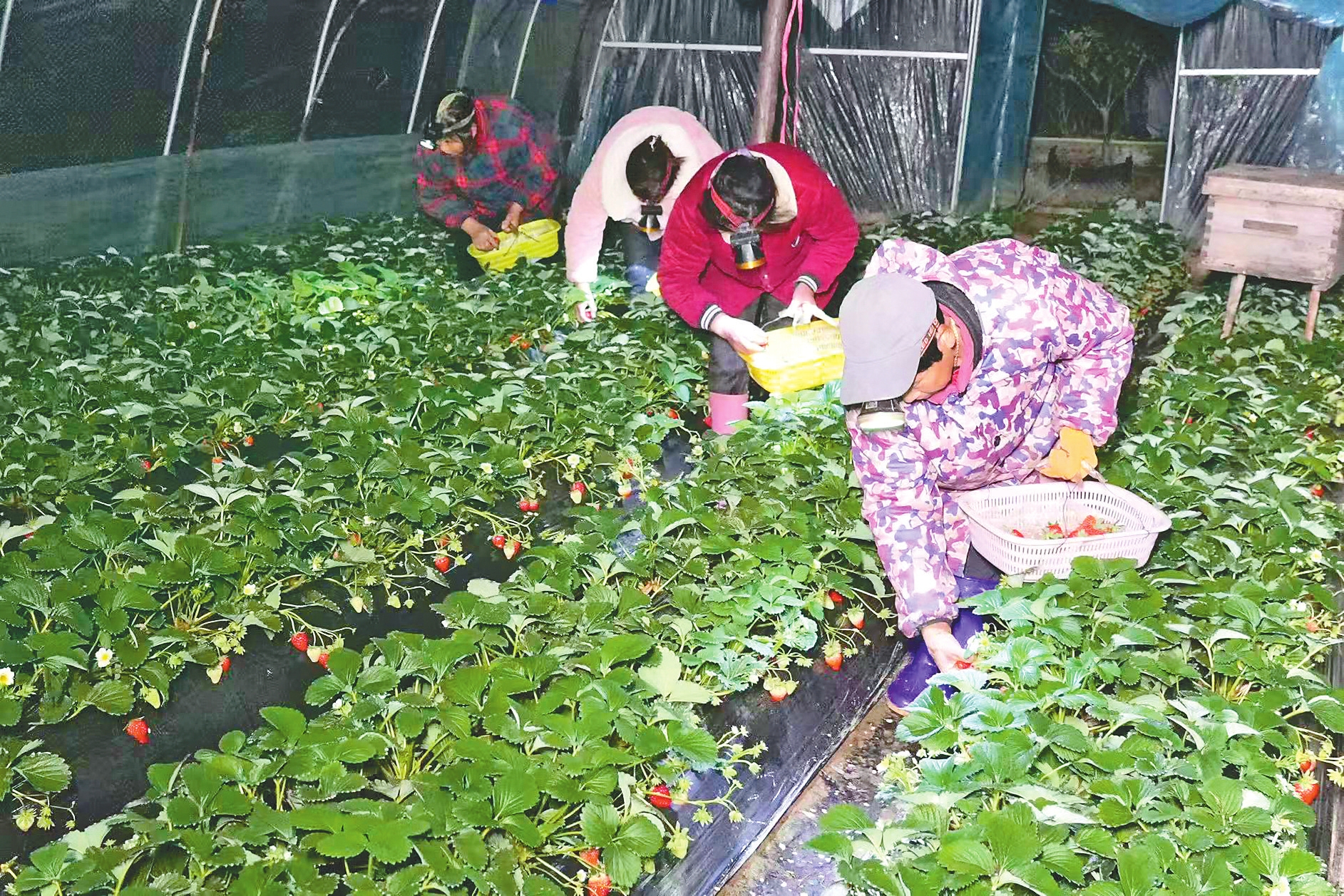 天还未亮,村民们便开始采摘草莓。