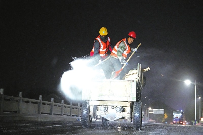 20日凌晨1时,室外气温已降至零下,小雪持续飘落。在桂花园大桥、南洲桥等重点桥梁路段,应急人员操作融雪剂撒布机等设备,对桥面进行预防性撒盐作业。相比传统人工方式,机械化作业不仅覆盖范围更广,效率也大幅提升。