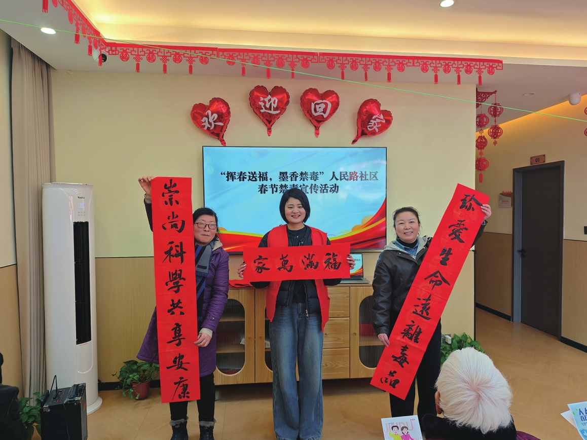 活动现场,社区邀请书法爱好者挥毫泼墨,书写一副副蕴含吉祥寓意、倡导生态理念和禁毒警示内容的春联与“福”字。红纸黑字传递了浓浓的年味,承载着对健康生活、绿色家园的美好期许。