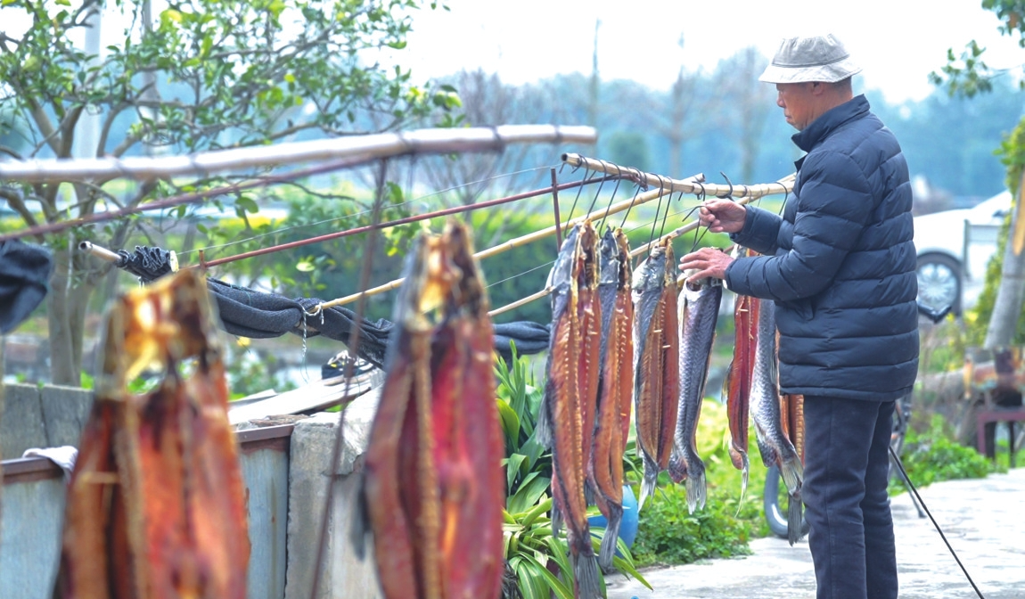 在大通湖区河坝镇沙堡洲渔村,家家户户的屋檐下则挂满了腊鱼。青鱼、草鱼经盐腌、烟熏、风干,肉质紧实泛红。切成鱼排下锅油炸,外酥里嫩,是渔村年夜饭的硬菜。而银鱼肉丸汤更是湖区人的冬日暖汤,手剁的肉丸弹嫩,配上银鱼的鲜,汤色奶白,暖胃又暖心。