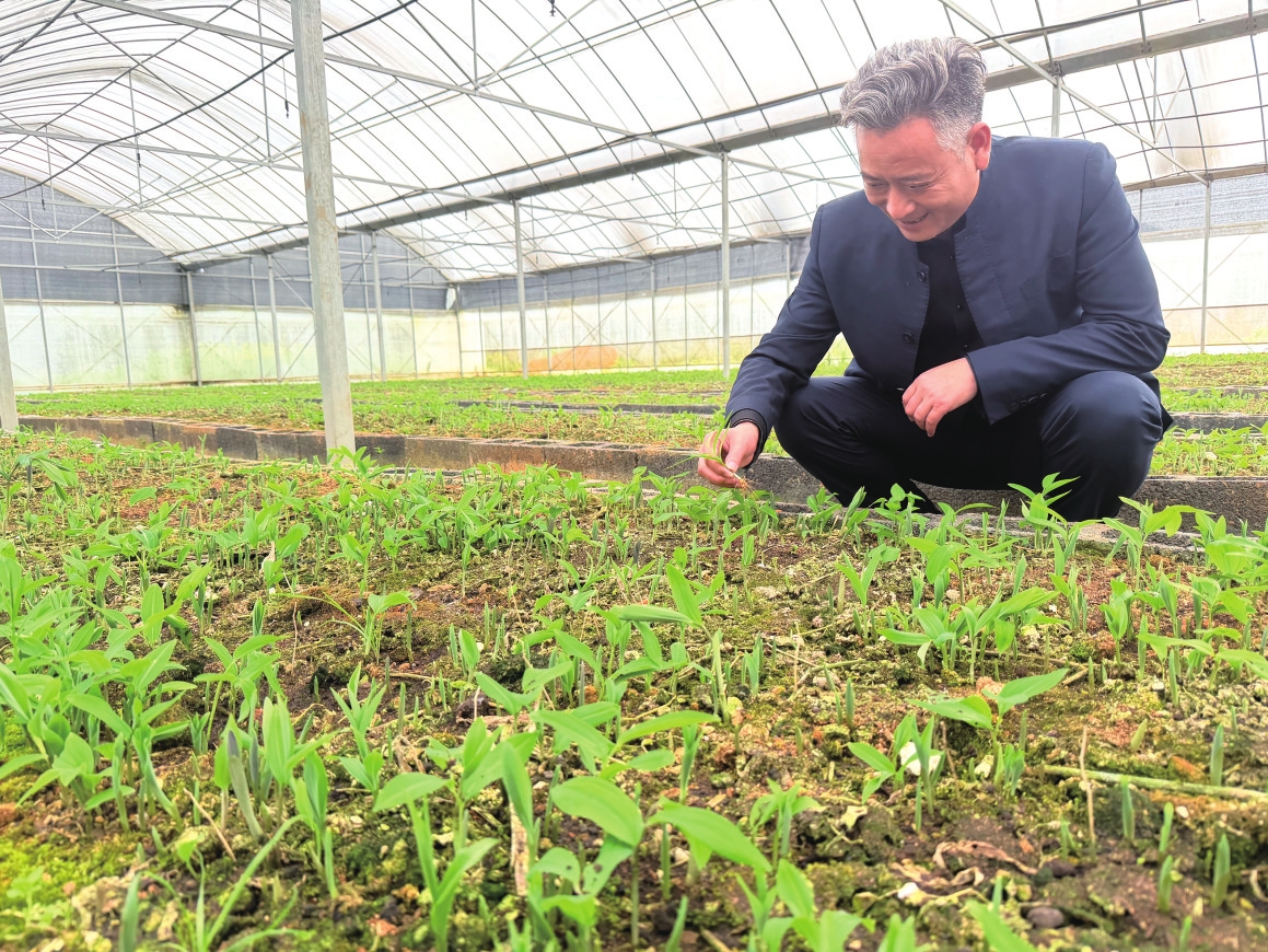 3月5日,安化县江南镇思贤村湖南省道地药材良种繁育基地内,一派生机勃勃的景象。基地负责人蒋丰登蹲在苗床边,仔细察看黄精种苗的长势。