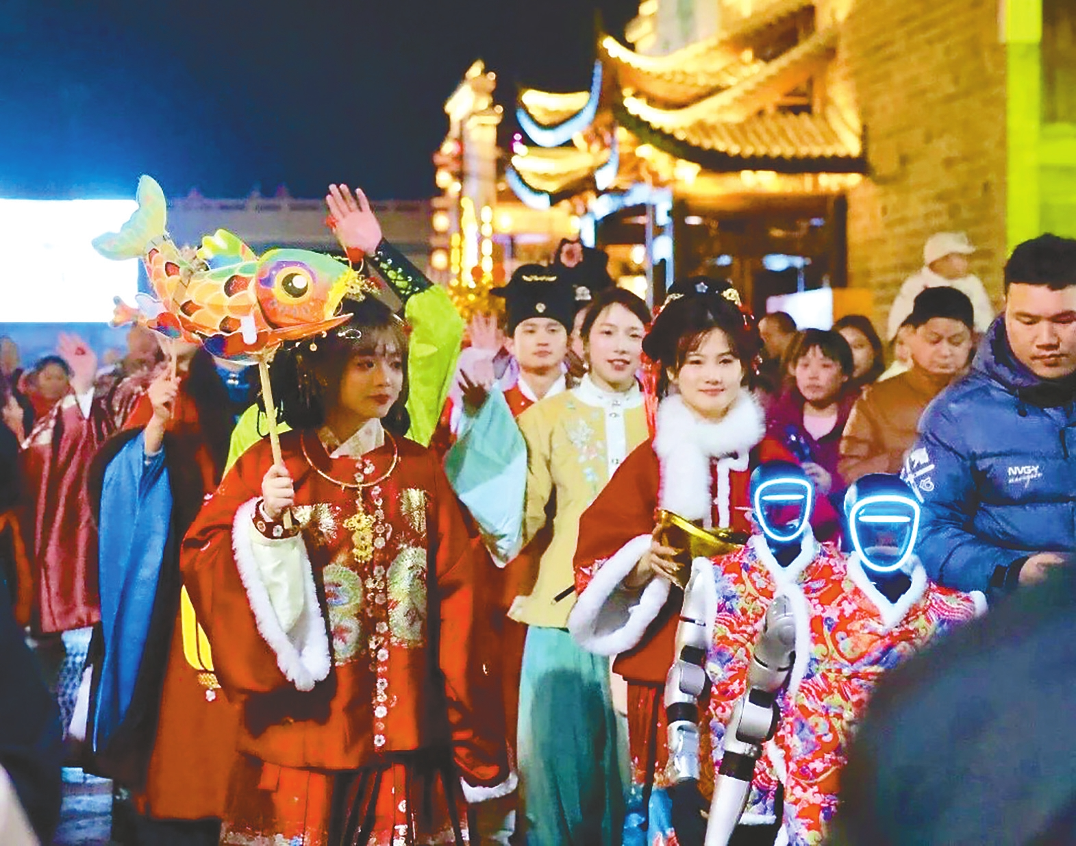 2月22日晚,资阳区明清古巷灯笼亮起,一群灵动自如的机器人正穿行在青石小巷,它们不仅奉上动感十足的歌舞表演,还亲切地和游客互动合影。“没想到它们这么灵动,还会跟我们打招呼!”来自广东的游客曾伟翔惊叹道。
