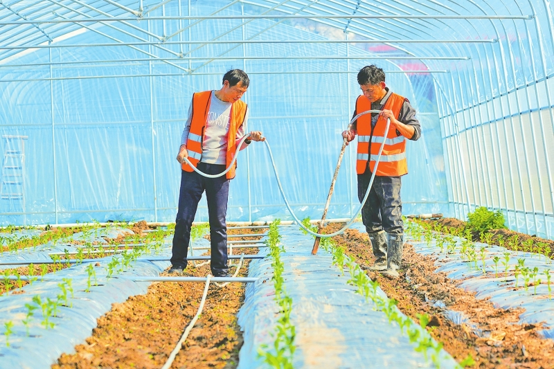 温室大棚内,务工村民进行打孔作业。刘馨予摄