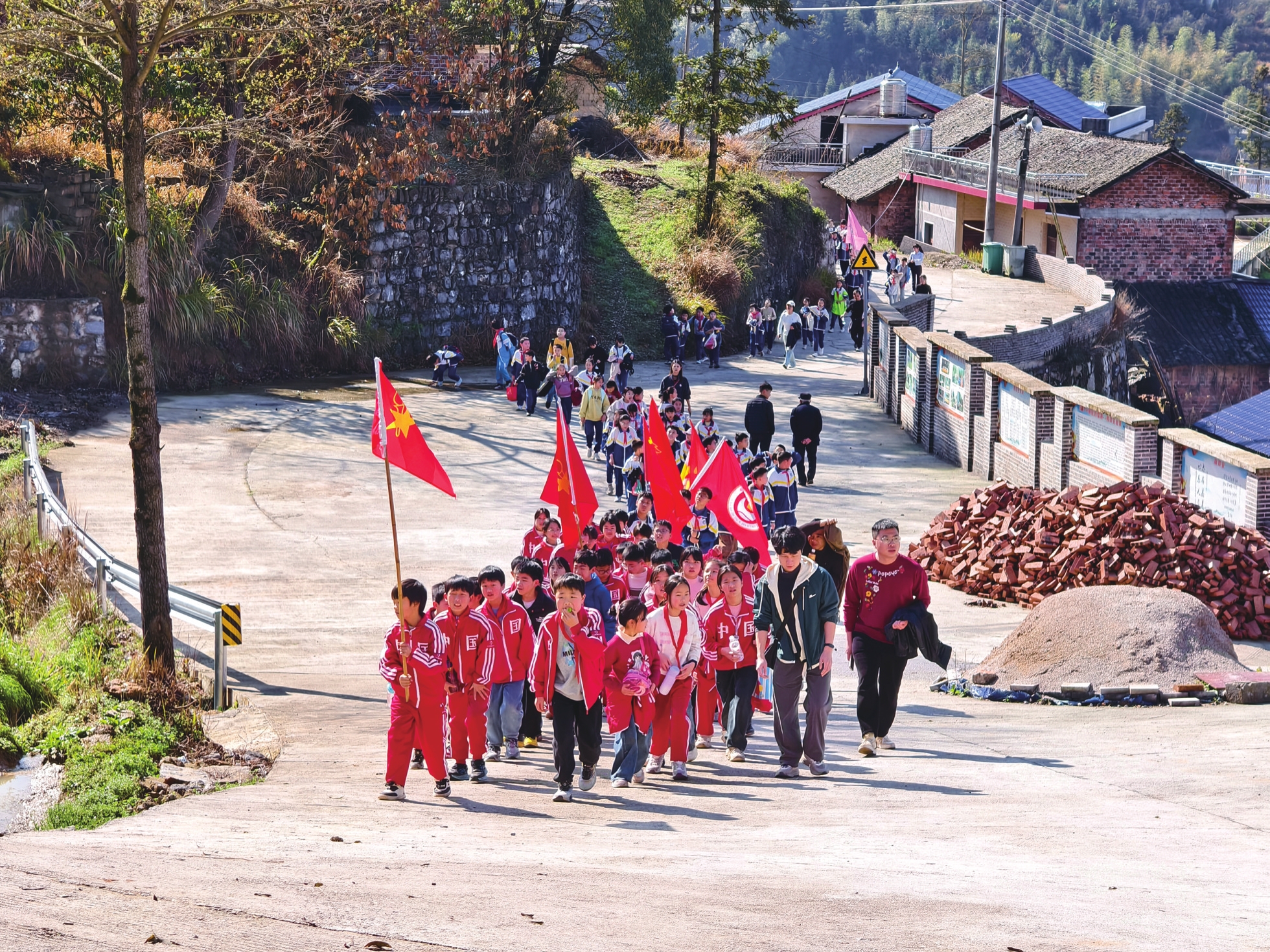 师生徒步前往故居。甘果摄