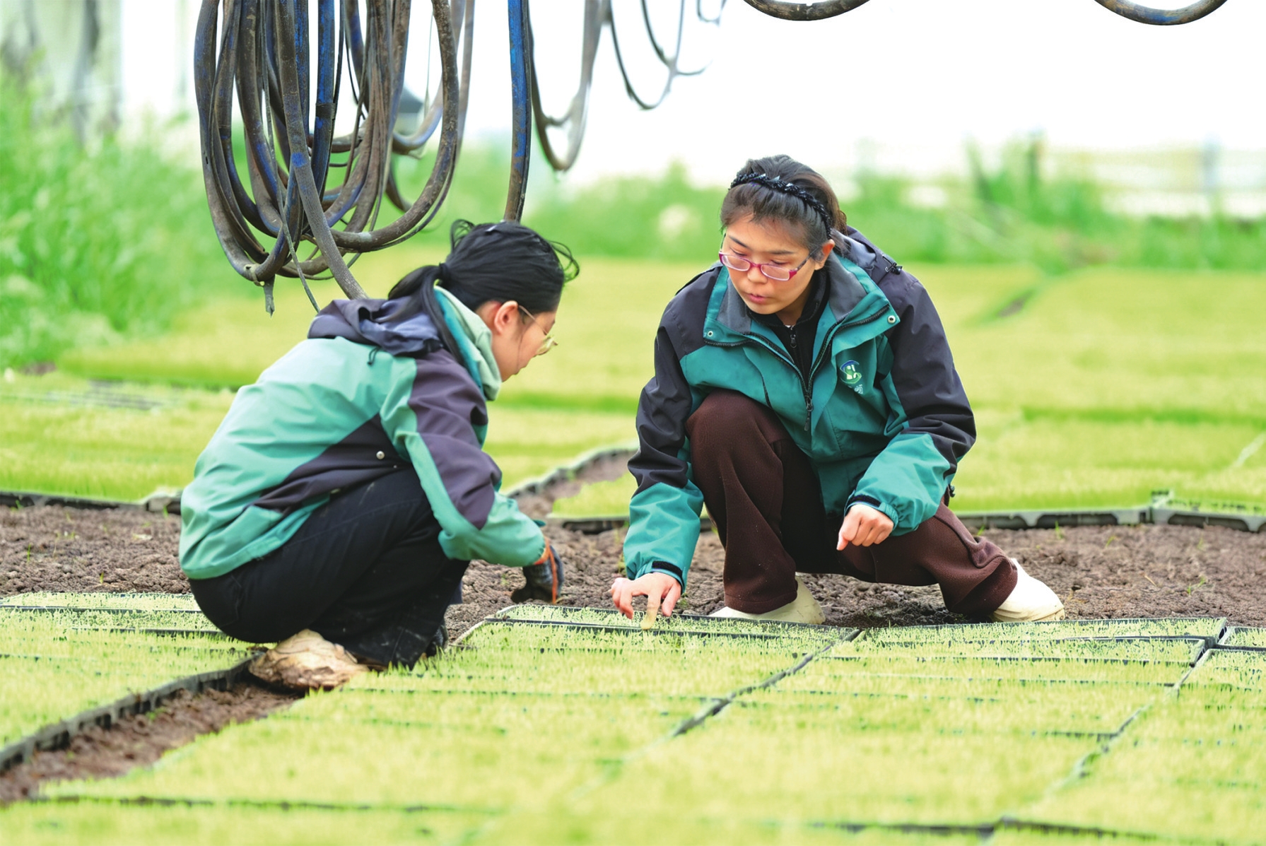 3月29日,大通湖区千山红镇,湖南宏硕生物科技有限公司工作人员正在智慧育秧大棚进行摆盘工作。周帅文摄