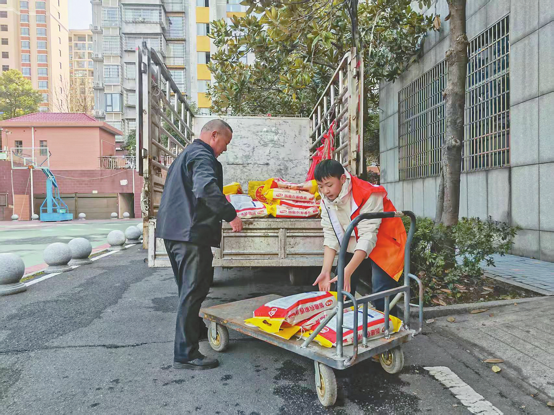 熊瀚东参加志愿服务活动,搬运救灾物资。