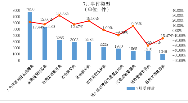 从受理事件大类分析:7月份,市民生活服务类环比增长30.36%,社会服务类环比增长19.5%,人力资源和社会保障类环比增长17.44%。