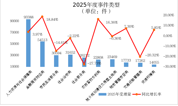 2.从受理事件大类分析:人力资源和社会保障领域诉求最多,共93388件,同比增长3.97%;增长较多的是金融商贸财经类54513件,同比增长18.84%;农林畜牧水利类22808件,同比增长16.36%。