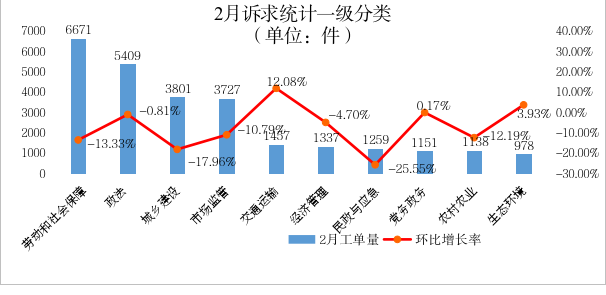 从诉求统计一级分类分析:2月份,事件受理量居前三位的分别为:劳动和社会保障、政法、城乡建设。总体情况平稳,无突发和群体性事件。