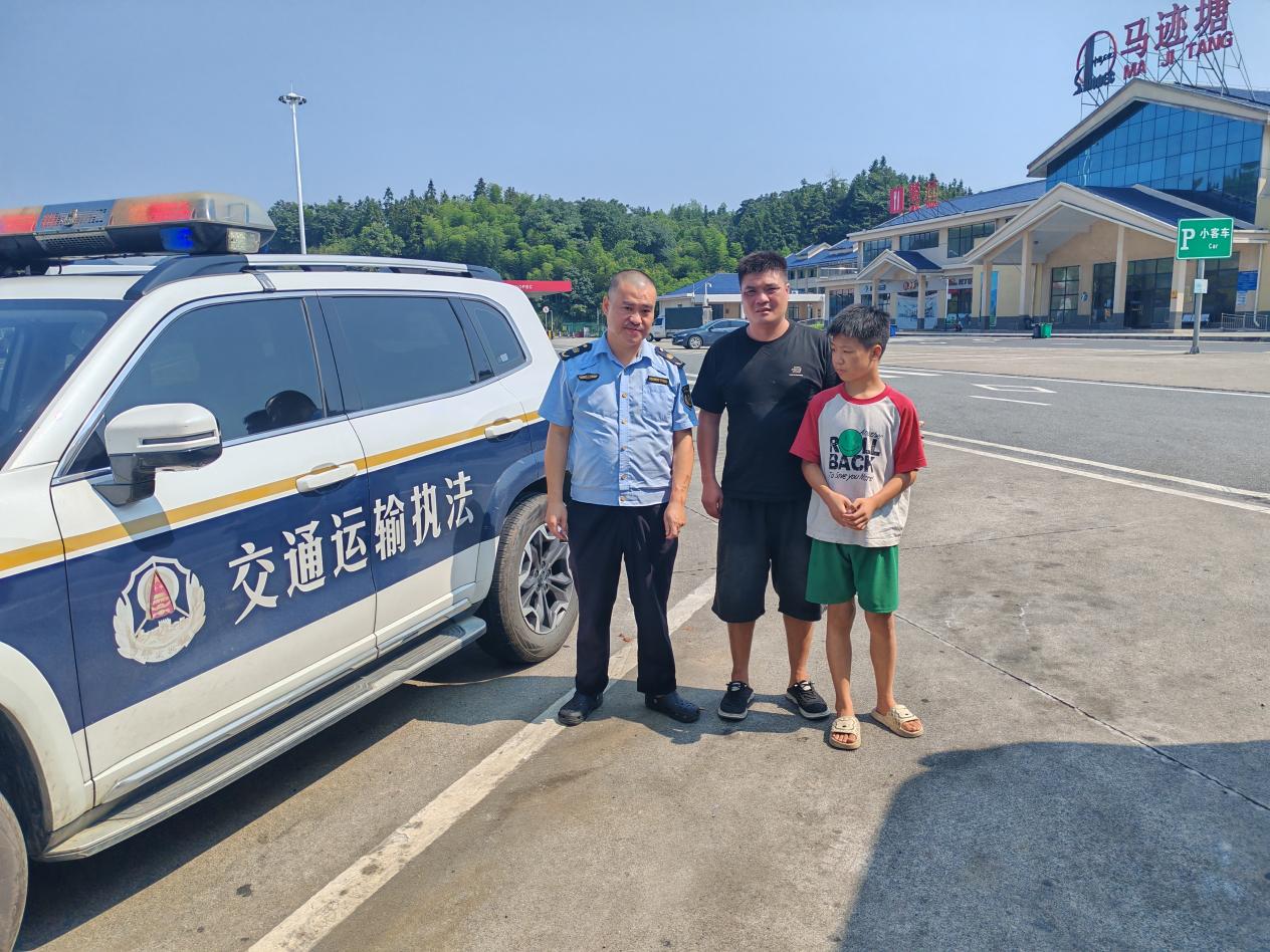 执法车辆载着男孩沿二广高速向南疾驰,约30分钟后将男孩安全送达马迹塘服务区,高效化解了一场高速公路上的“寻亲危机”。见到儿子的郑师傅紧握执法人员双手连声道谢:“发现孩子不见时已开出20多公里,要不是你们,我真不知道该怎么办,太感谢了!”