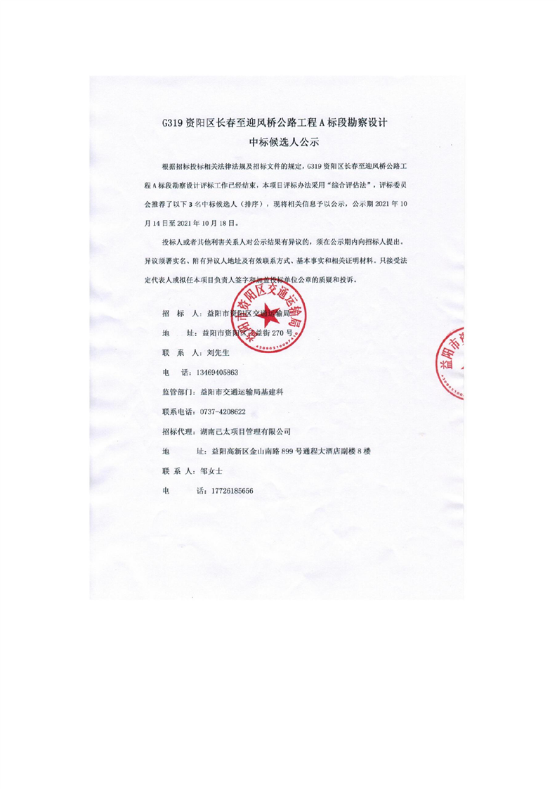 G319资阳区长春至迎风桥公路工程A标段勘察设计中标候选人公示