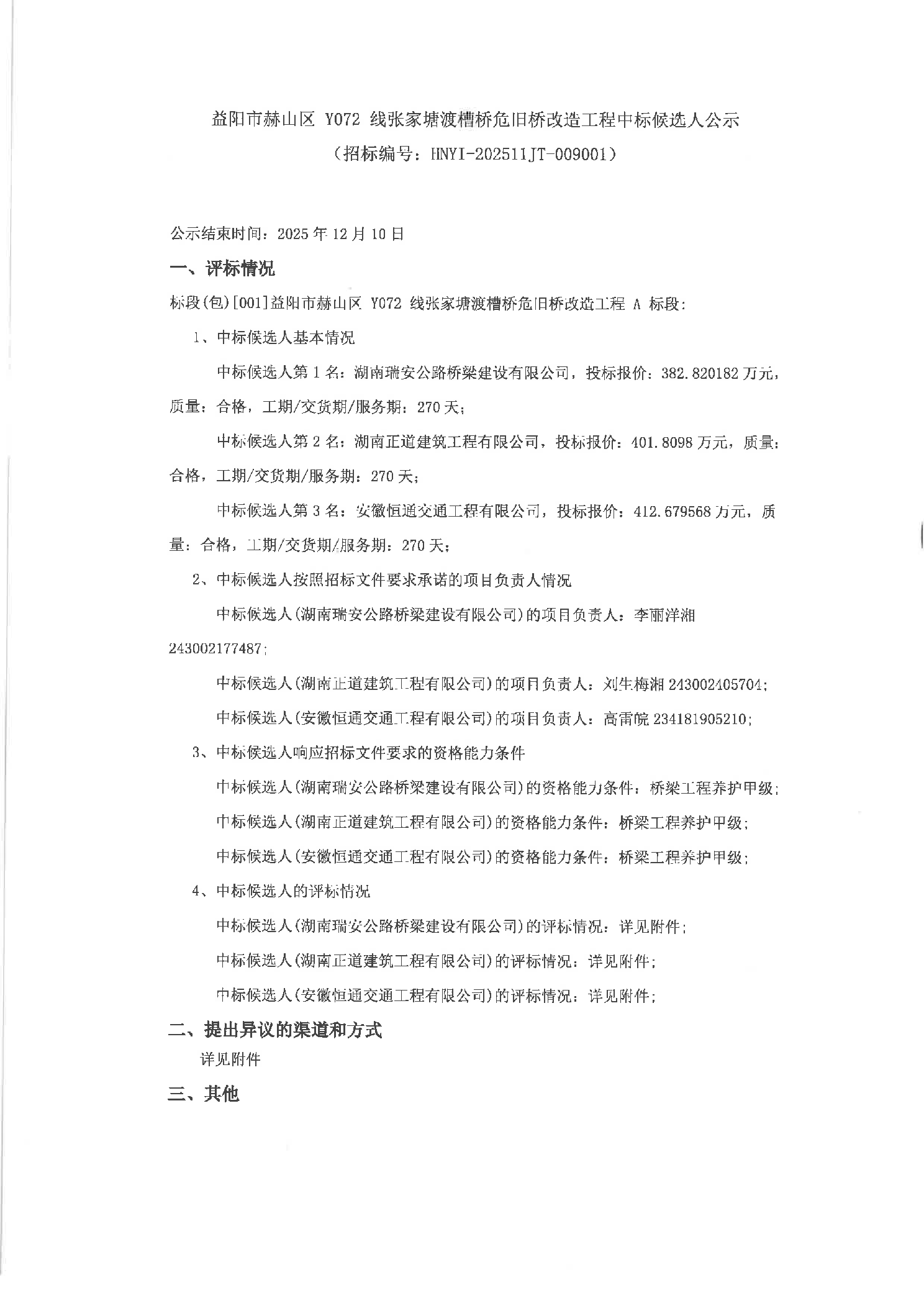 益阳市赫山区Y072线张家塘渡槽桥危旧桥改造工程中标候选人公示
