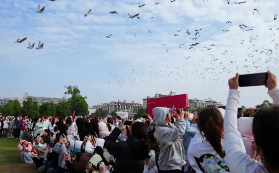 伴随着激昂的《运动员进行曲》,国旗队拥护着国旗、校旗率先进入会场。紧接着,彩旗队、花环队、裁判员方阵、各学院师生代表队依次迈着整齐的步伐入场。开幕式尾声,千只白鸽从主席台侧腾空飞起,各项赛事随即正式开始。