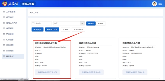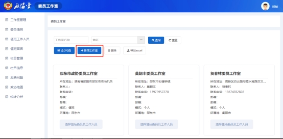 在工作室管理界面选择单条工作室信息点击操作列中的【选择驻站委员及工作人员】即可对改工作室的驻站委员及工作人员进行选择。如图2.3所示。