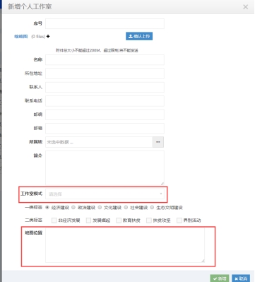 在新增界面选择对应的工作室模式,在地图位置放置填写对应的工作室地图经纬度,如图2.1.1所示。